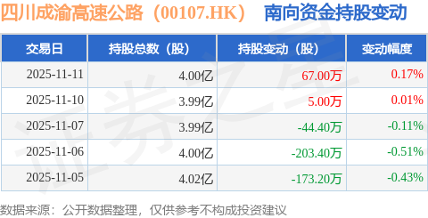 证券之星消息,11月11日南向资金增持67.0万股四川成渝高速公路(00107.HK)。近5个交易日中,获南向资金减持的有3天,累计净减持349.0万股。近20个交易日中,获南向资金减持的有15天,累计净减持996.6万股。截至目前,南向资金持有四川成渝高速公路(00107.HK)4.0亿股,占公司已发行普通股的44.65%。