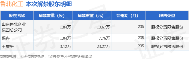 证券之星消息,根据市场公开信息整理,鲁北化工(600727)于11月12日将有6.0万股限售股份解禁,为公司股权分置限售股份,占公司总股本0.01%。(本次数据根据历史公告整理得出,实际情况以上市公司最新公告为准)本次解禁后,公司已无限售股份。具体如下图所示:
