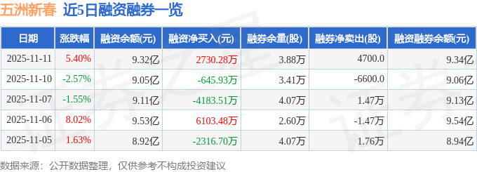 五洲新春融资融券信息显示,融资方面,当日融资买入2.26亿元,融资偿还1.99亿元,融资净买入2730.28万元。融券方面,融券卖出5000.0股,融券偿还300.0股,融券余量3.88万股,融券余额187.68万元。融资融券余额9.34亿元。