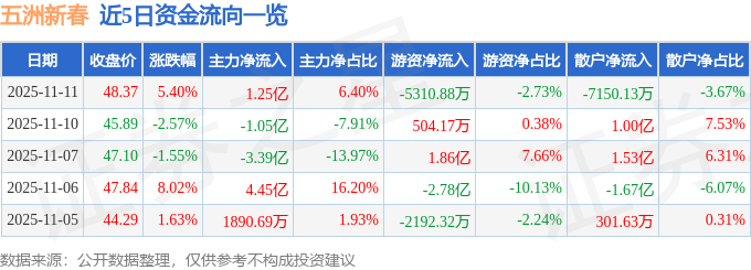 证券之星消息,截至2025年11月11日收盘,五洲新春(603667)报收于48.37元,上涨5.4%,换手率11.18%,成交量40.95万手,成交额19.48亿元。