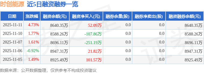 时创能源融资融券信息显示,融资方面,当日融资买入752.3万元,融资偿还700.21万元,融资净买入52.09万元。融券方面,融券卖出0.0股,融券偿还0.0股,融券余量0.0股,融券余额0.0万元。融资融券余额8640.35万元。