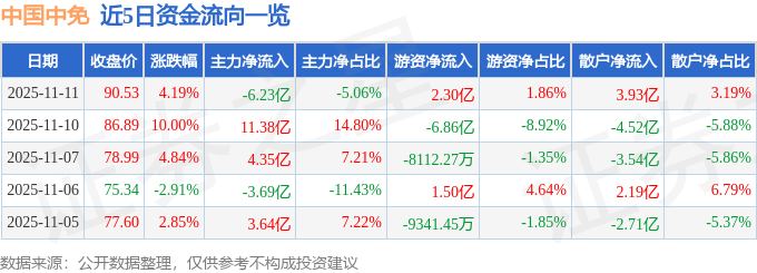 证券之星消息,截至2025年11月11日收盘,中国中免(601888)报收于90.53元,上涨4.19%,换手率7.08%,成交量138.27万手,成交额123.2亿元。