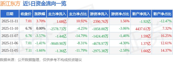 证券之星消息,截至2025年11月11日收盘,浙江东方(600120)报收于7.01元,上涨3.7%,换手率6.45%,成交量220.24万手,成交额15.37亿元。