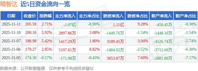 证券之星消息,截至2025年11月11日收盘,精智达(688627)报收于205.59元,上涨2.71%,换手率7.81%,成交量5.65万手,成交额11.99亿元。