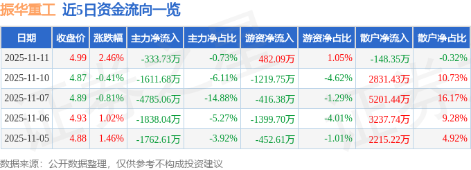 证券之星消息,截至2025年11月11日收盘,振华重工(600320)报收于4.99元,上涨2.46%,换手率2.76%,成交量91.62万手,成交额4.58亿元。