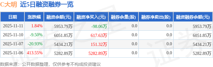 C大明融资融券信息显示,融资方面,当日融资买入2498.68万元,融资偿还2596.74万元,融资净偿还98.06万元。融券方面,融券卖出0.0股,融券偿还0.0股,融券余量0.0股,融券余额0.0万元。融资融券余额5953.79万元。