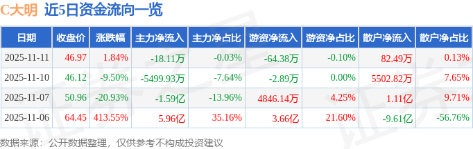 证券之星消息,截至2025年11月11日收盘,C大明(603376)报收于46.97元,上涨1.84%,换手率44.66%,成交量13.86万手,成交额6.47亿元。