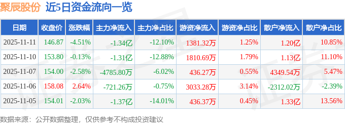 证券之星消息,截至2025年11月11日收盘,聚辰股份(688123)报收于146.87元,下跌4.51%,换手率4.66%,成交量7.38万手,成交额11.07亿元。