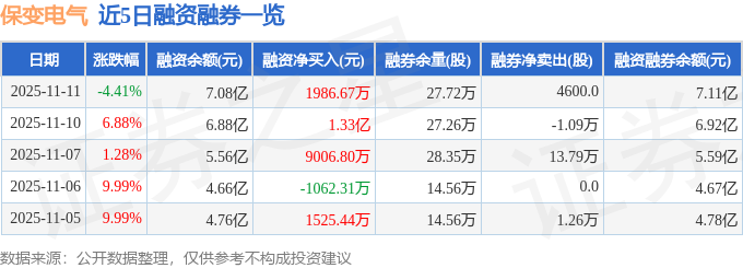 保变电气融资融券信息显示,融资方面,当日融资买入3.58亿元,融资偿还3.38亿元,融资净买入1986.67万元,连续3日净买入累计2.43亿元。融券方面,融券卖出8200.0股,融券偿还3600.0股,融券余量27.72万股,融券余额312.68万元。融资融券余额7.11亿元。