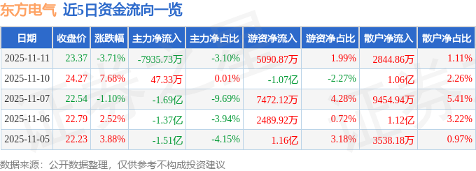 证券之星消息,截至2025年11月11日收盘,东方电气(600875)报收于23.37元,下跌3.71%,换手率4.79%,成交量108.41万手,成交额25.62亿元。