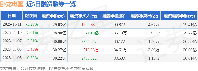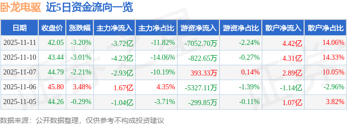 证券之星消息,截至2025年11月11日收盘,卧龙电驱(600580)报收于42.05元,下跌3.2%,换手率4.72%,成交量73.74万手,成交额31.44亿元。