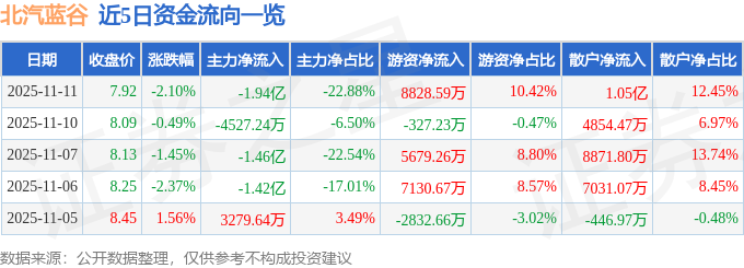 证券之星消息,截至2025年11月11日收盘,北汽蓝谷(600733)报收于7.92元,下跌2.1%,换手率2.18%,成交量106.7万手,成交额8.47亿元。