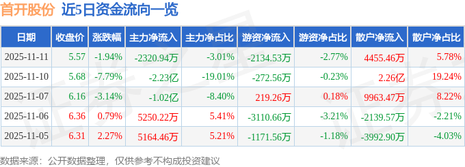 证券之星消息,截至2025年11月11日收盘,首开股份(600376)报收于5.57元,下跌1.94%,换手率5.34%,成交量137.87万手,成交额7.71亿元。