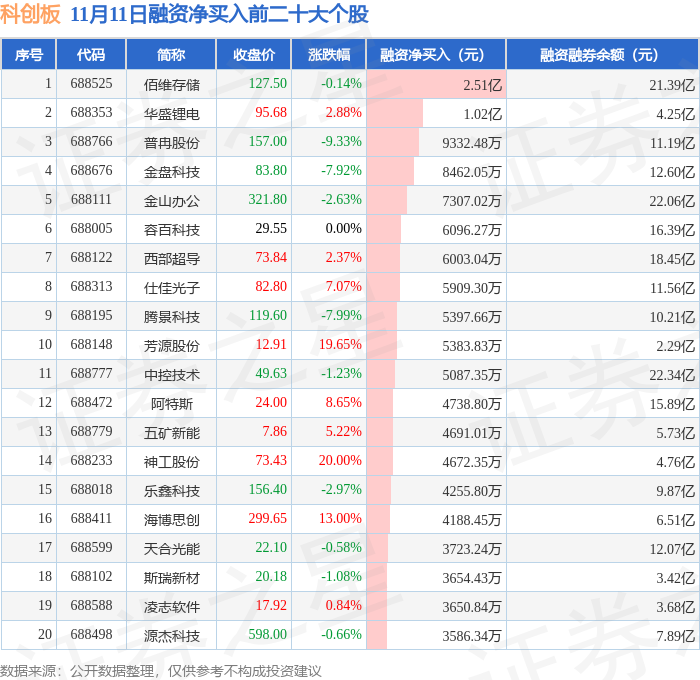 科创板融资净买入前三分别为:佰维存储(688525)融资净买入2.51亿元、华盛锂电(688353)融资净买入1.02亿元、普冉股份(688766)融资净买入9332.48万元,前20具体见下表: