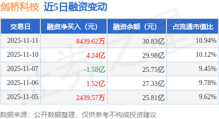 证券之星消息,11月11日,剑桥科技(603083)融资买入7.0亿元,融资偿还6.16亿元,融资净买入8439.62万元,融资余额30.83亿元,近20个交易日中有11个交易日出现融资净买入。
