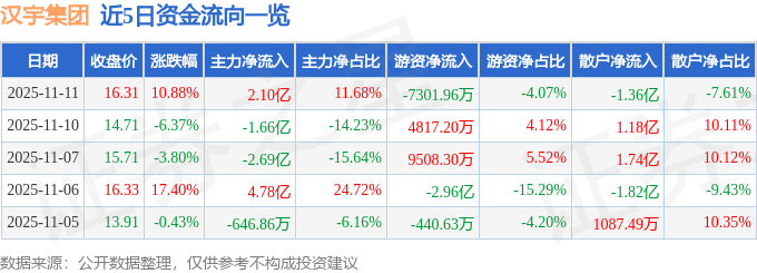 证券之星消息,截至2025年11月11日收盘,汉宇集团(300403)报收于16.31元,上涨10.88%,换手率26.59%,成交量113.55万手,成交额17.94亿元。