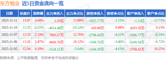 11月11日的资金流向数据方面,主力资金净流入1.25亿元,占总成交额13.88%,游资资金净流出1037.77万元,占总成交额1.15%,散户资金净流出1.15亿元,占总成交额12.73%。