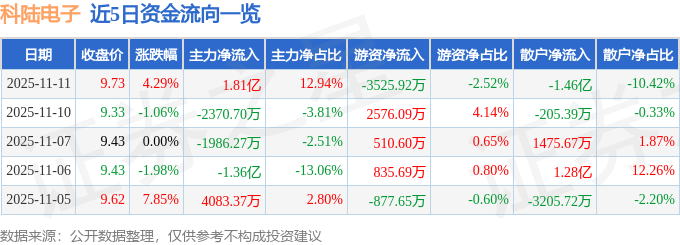 证券之星消息,截至2025年11月11日收盘,科陆电子(002121)报收于9.73元,上涨4.29%,换手率10.21%,成交量142.96万手,成交额14.02亿元。