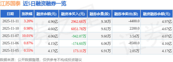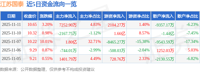 证券之星消息,截至2025年11月11日收盘,江苏国泰(002091)报收于10.65元,上涨3.2%,换手率9.04%,成交量144.46万手,成交额15.03亿元。