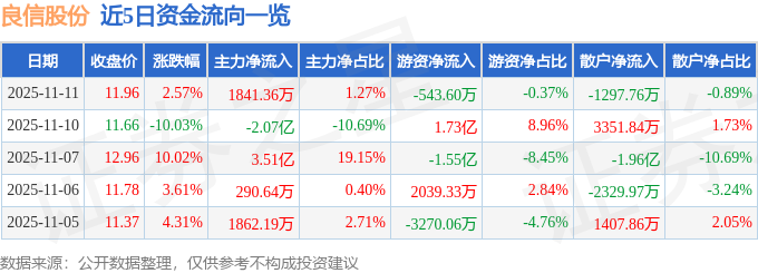 证券之星消息,截至2025年11月11日收盘,良信股份(002706)报收于11.96元,上涨2.57%,换手率13.14%,成交量120.2万手,成交额14.51亿元。