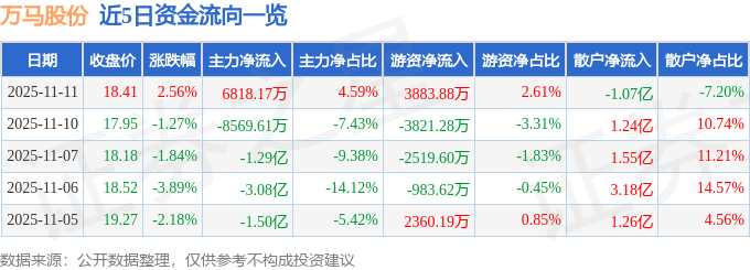 证券之星消息,截至2025年11月11日收盘,万马股份(002276)报收于18.41元,上涨2.56%,换手率8.07%,成交量81.24万手,成交额14.86亿元。