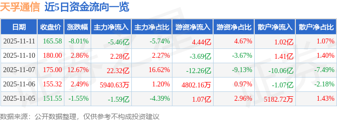 证券之星消息,截至2025年11月11日收盘,天孚通信(300394)报收于165.58元,下跌8.01%,换手率7.16%,成交量55.56万手,成交额95.13亿元。