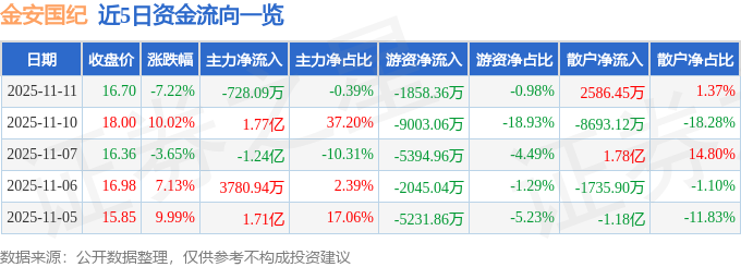 证券之星消息,截至2025年11月11日收盘,金安国纪(002636)报收于16.7元,下跌7.22%,换手率14.96%,成交量108.36万手,成交额18.91亿元。