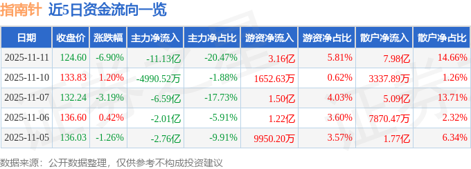 证券之星消息,截至2025年11月11日收盘,指南针(300803)报收于124.6元,下跌6.9%,换手率7.12%,成交量42.65万手,成交额54.39亿元。