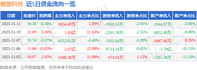 证券之星消息,截至2025年11月11日收盘,模塑科技(000700)报收于10.36元,下跌6.58%,换手率11.49%,成交量105.48万手,成交额11.58亿元。