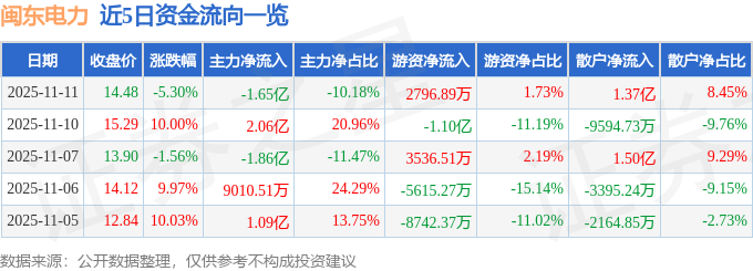 证券之星消息,截至2025年11月11日收盘,闽东电力(000993)报收于14.48元,下跌5.3%,换手率23.93%,成交量105.23万手,成交额16.21亿元。