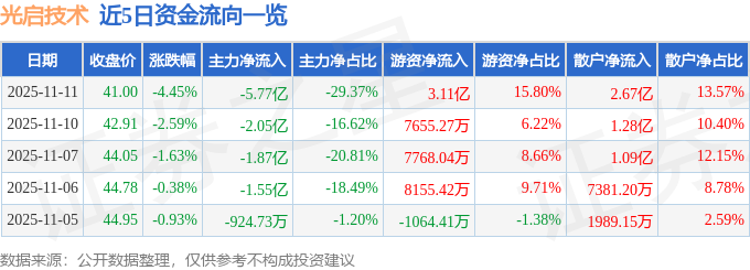 证券之星消息,截至2025年11月11日收盘,光启技术(002625)报收于41.0元,下跌4.45%,换手率2.2%,成交量47.3万手,成交额19.66亿元。