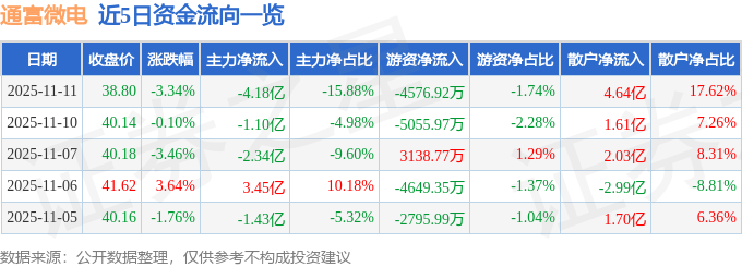 证券之星消息,截至2025年11月11日收盘,通富微电(002156)报收于38.8元,下跌3.34%,换手率4.41%,成交量66.92万手,成交额26.34亿元。