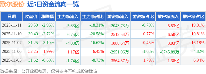 证券之星消息,截至2025年11月11日收盘,歌尔股份(002241)报收于29.5元,下跌2.96%,换手率3.12%,成交量97.8万手,成交额29.09亿元。