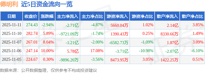 证券之星消息,截至2025年11月11日收盘,德明利(001309)报收于274.43元,下跌2.94%,换手率12.22%,成交量19.65万手,成交额55.58亿元。