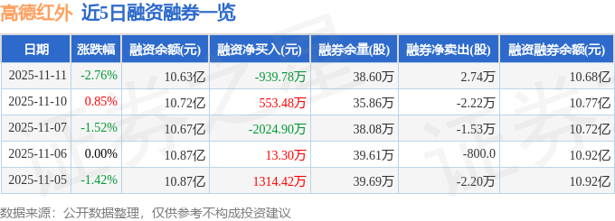 高德红外融资融券信息显示,融资方面,当日融资买入5720.41万元,融资偿还6660.19万元,融资净偿还939.78万元。融券方面,融券卖出4.85万股,融券偿还2.11万股,融券余量38.6万股,融券余额490.18万元。融资融券余额10.68亿元。