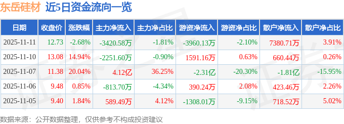 证券之星消息,截至2025年11月11日收盘,东岳硅材(300821)报收于12.73元,下跌2.68%,换手率12.23%,成交量146.79万手,成交额18.89亿元。
