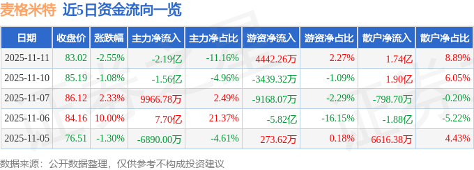 证券之星消息,截至2025年11月11日收盘,麦格米特(002851)报收于83.02元,下跌2.55%,换手率5.05%,成交量23.14万手,成交额19.58亿元。