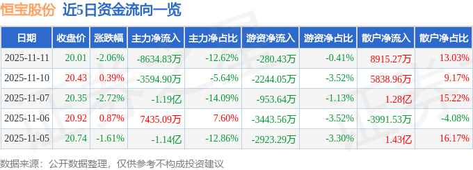 证券之星消息,截至2025年11月11日收盘,恒宝股份(002104)报收于20.01元,下跌2.06%,换手率5.67%,成交量34.01万手,成交额6.84亿元。