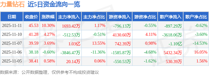 证券之星消息,截至2025年11月11日收盘,力量钻石(301071)报收于45.53元,上涨10.3%,换手率16.71%,成交量32.51万手,成交额14.53亿元。