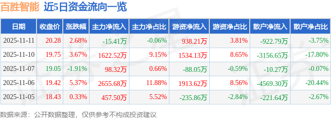 证券之星消息,截至2025年11月11日收盘,百胜智能(301083)报收于20.28元,上涨2.68%,换手率14.15%,成交量12.11万手,成交额2.46亿元。