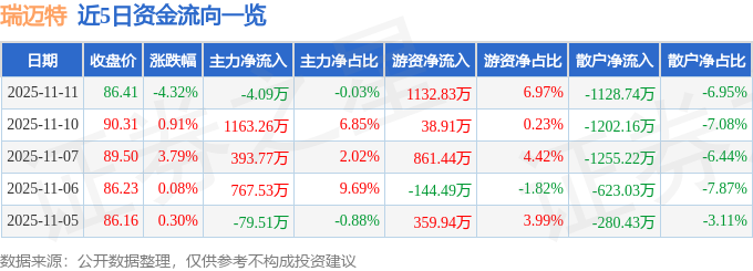 证券之星消息,截至2025年11月11日收盘,瑞迈特(301367)报收于86.41元,下跌4.32%,换手率2.66%,成交量1.86万手,成交额1.63亿元。