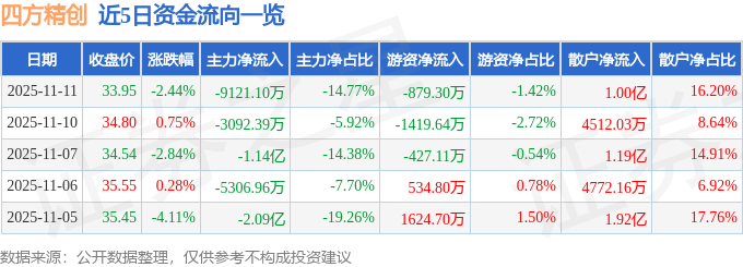证券之星消息,截至2025年11月11日收盘,四方精创(300468)报收于33.95元,下跌2.44%,换手率3.4%,成交量18.03万手,成交额6.17亿元。