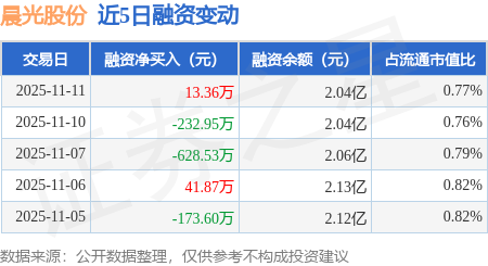 证券之星消息,11月11日,晨光股份(603899)融资买入959.65万元,融资偿还946.29万元,融资净买入13.36万元,融资余额2.04亿元。