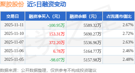 证券之星消息,11月11日,聚胶股份(301283)融资买入319.38万元,融资偿还420.33万元,融资净卖出100.95万元,融资余额5589.32万元,近20个交易日中有11个交易日出现融资净买入。