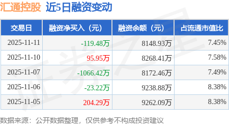 证券之星消息,11月11日,汇通控股(603409)融资买入154.08万元,融资偿还273.56万元,融资净卖出119.48万元,融资余额8148.93万元。