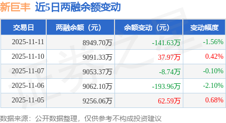 证券之星消息,11月11日,新巨丰(301296)融资买入136.02万元,融资偿还277.66万元,融资净卖出141.63万元,融资余额8949.7万元,近20个交易日中有11个交易日出现融资净买入。