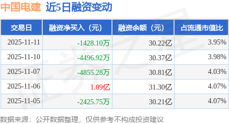 证券之星消息,11月11日,中国电建(601669)融资买入1.25亿元,融资偿还1.39亿元,融资净卖出1428.1万元,融资余额30.22亿元。