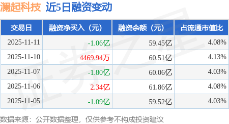 证券之星消息,11月11日,澜起科技(688008)融资买入3.4亿元,融资偿还4.46亿元,融资净卖出1.06亿元,融资余额59.45亿元。
