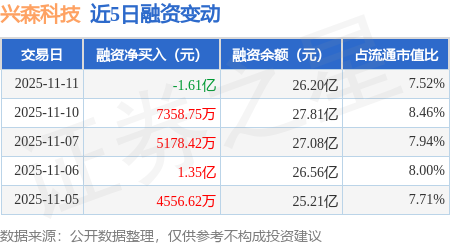 证券之星消息,11月11日,兴森科技(002436)融资买入9.05亿元,融资偿还10.66亿元,融资净卖出1.61亿元,融资余额26.2亿元,近20个交易日中有13个交易日出现融资净买入。