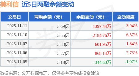 证券之星消息,11月11日,美利信(301307)融资买入4008.96万元,融资偿还2611.52万元,融资净买入1397.44万元,融资余额3.69亿元,近3个交易日已连续净买入累计4184.15万元,近20个交易日中有12个交易日出现融资净买入。